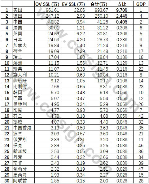 具体统计数据如下图所示,数字为SSL证书申请张数,以万为单位,排名第一的是美国,占全球的比例是 9.70%,第二是德国,占比 2.44%,第三是中国,占比 0.40%。笔者看到这个数据时非常激动,因为根据Netcraft 2017年1月的统计数据,当时我国SSL证书申请量全球排名是 第25位,5年后的今天已经跃升到 第3位,有力证明了我国互联网包括移动互联网发展迅猛,安全保障水平显著提升。统计表中的全球国家和地区GDP排名仅用于方便读者对比参考GDP的排名,这与SSL证书的申请量应该是有一定的对应关系的。
