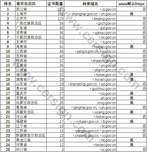 到底市场机会有多大,我们还是用数据说话。由于我国各省市已经启动了全省一个主域名,下属各局委办都是使用其子域名的管理方式,所以,我们检索了一个省的域名就能得到这个省的政府网站一共申请了多少张证书,如广东省统计*.gd.gov.cn的域名(这里的*指gd.gov.cn下的所有子域名),各地市使用了自己域名,如深圳市的*.sz.gov.cn并不在广东省的统计数据中,如果各居委办使用了独立.gov.cn域名也不在统计之列。如果某省市启用了两个域名,如上海市的sh.gov.cn和shanghai.gov.cn,则合并统计两个域名的SSL证书申请数量。