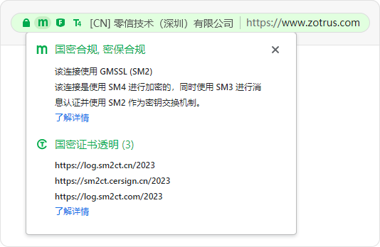 也就是说,零信浏览器不仅同时支持识别和验证国际SSL证书和国密SSL证书中的证书透明日志签名数据,不仅同时支持国际算法(ECC/SHA2)和国密算法(SM2/SM3)实现的证书透明,而且把证书透明日志签名数据相关的信息都汇总到一个用户界面上,让用户对所有密码算法的SSL证书的证书透明信息一目了然。