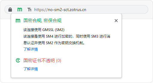 如果国际SSL证书没有内置证书透明日志数据,则零信浏览器同谷歌浏览器一样的提示“不安全”,如下左图所示。而对于国密SSL证书,考虑到国密证书透明标准还在制定过程中,各个CA机构还需要时间升级CA系统支持国密证书透明,如果国密SSL证书中没有内置零信浏览器信任的国密证书透明日志签名数据,则零信浏览器暂时只是提示“证书不透明”,如下右图所示。零信浏览器计划于2024年1月1日开始采用同谷歌浏览器一样的政策显示为“不安全”,希望各个零信浏览器信任的国密根CA机构能尽快完成CA系统升级,尽快签发内嵌零信浏览器信任的国密证书透明日志数据的国密SSL证书。