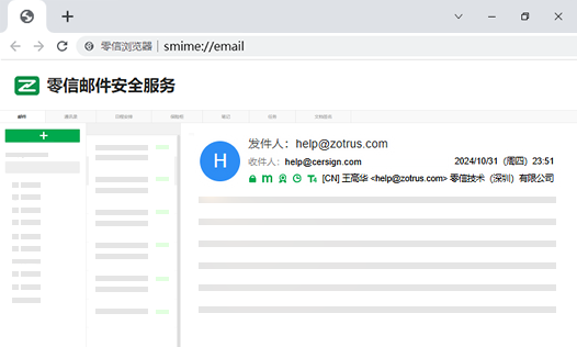 零信浏览器免费自动配置邮件签名证书和加密证书,默认自动发送加密和数字签名邮件,实时验证每封邮件的数字签名,并展示邮件签名者可信身份,杜绝电子邮件身份欺诈。实时解密已加密邮件,杜绝电子邮件内容欺诈,确保电子邮件的在途和在云安全。
