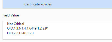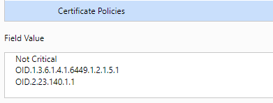 All publicly trusted RSA/ECC SSL certificates will contain one of these 4 OIDs in the "Certificate Policy" field of the SSL certificate to prove what type of SSL certificate this SSL certificate is. The left picture below shows the certificate policy "Policy Identifier=2.23.140.1.2.1" of the SSL certificate deployed on the ZoTrus official website, which indicates that this SSL certificate is a DV SSL certificate, and the right picture shows the SSL certificate deployed on the CerSign official website, the certificate policy is "Policy Identifier=2.23.140.1.1", which indicates that this SSL certificate is an EV SSL certificate.