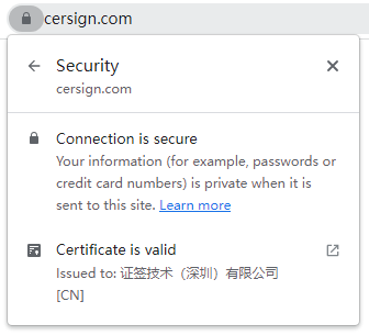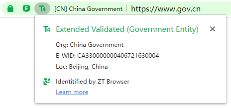 Although other browsers have now abandoned the green address bar of the EV SSL certificate, Z Browser believes that the EV green address bar is still very valuable, allowing users to recognize at a glance that this website is a highly trusted website, because its real identity has been strictly validated by a trusted third-party. Therefore, ZT Browser continues to maintain the green address bar of the EV SSL certificate, and continues to display the green address bar for websites that deployed EV SSL certificate. Other types of SSL certificates also identify the type of SSL certificate deployed by the website according to the international standard certificate type OID, thus displaying different UIs. For websites deployed with DV SSL certificates, the address bar displays the T1 icon, while for websites deployed with EV SSL certificate, the address bar displays the T4 icon.