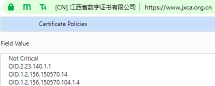 Back to the user's question, the "Certificate Policies" of the SM2 SSL certificate deployed by the Bank of Beijing does not contain one of the four OIDs shown above, as shown in the left figure below. Therefore, ZT Browser can only display the "T1" icon, because the reason why this SSL certificate can be issued must have completed the domain control validation and must meet the requirements for displaying the T1 icon. Users will definitely ask: Since there is no required OID, why can the 97 version can display the "T3" icon? Please see the picture on the right, there is an O field in the subject of this SSL certificate. The 97 version is based on the fact that this SSL certificate has an O field, so the Browser displayed the T3 icon and the name of the organization in the certificate O field. This is a compromise plan after finding that almost all SM2 SSL certificates do not have a certificate type OID at the release of ZT Browser. After upgrading to version 114 now, ZTBrowser adjusted the UI policy to display the SSL certificate type deployed on the website in strict accordance with international standards. Therefore, the new version browser displays the "T1" icon because it cannot find the required certificate type OID.
