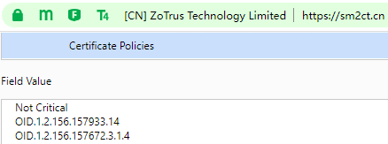 That is to say, ZT Browser will idetify the type of SM2 SSL certificate based on the 4 international standard certificate type OIDs and 4 ZT Browser defined certificate type OIDs. If the certificate policy of the SSL certificate contains OID: 1.2.156.157933.14 or 2.23 .140.1.1, ZT Browser will know that this SSL certificate is an EV SSL certificate, and will display the T4 icon, as shown in the left figure below, the "Certificate Policies" in this SM2 SSL certificate has "Policy ID: 2.23.140.1 .1", ZT Browser displays the T4 icon. As shown in the figure on the right below, the "Certificate Policies" in this SM2 SSL certificate has "Policy ID: 1.2.156.157933.14", ZT Browser also displays the T4 icon.