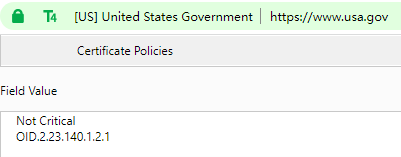 Careful readers may also ask: The certificate policy in the SSL certificate deployed in ZoTrus website is "OID.2.23.140.1.2.1" that it is a DV SSL certificate, why does the ZT Browser display the T4 icon? Similarly, why does the official website of the USA government deploy the DV SSL certificate (OID.2.23.140.1.2.1), but why does ZT Browser display the T4 icon?