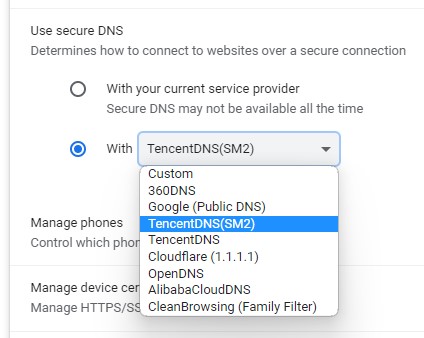 The second of ZoTrus DNS encryption solution is that ZT Browser supports DoH/DoT encrypted DNS service, users can enable encrypted DNS service in the "Use secure DNS" menu. ZT Browser provides DNS encryption services for users to browse the Internet, which effectively guarantees the privacy and security of users. ZT Browser released an upgraded version today, adding 4 well-known China encrypted DNS services on the basis of the default built-in 4 world-renowned encrypted DNS services in Chromium, it is recommended to choose TencentDNS(SM2), which is the only encrypted DNS service (DoH) that the author has found at present, which uses the SM2 algorithm to achieve the encrypted DNS service. ZT Browser will automatically use the SM2 algorithm to encrypt DNS information to achieve the full Internet security and SM2 protection of SM2 DNS encryption and SM2 HTTPS encryption.