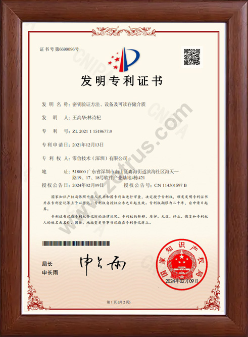 今天,公司节后开工就迎来喜讯—收到国家知识产权局颁发的发明专利证书,这是公司在2021年12月申请的四个发明专利之一《密钥验证方法、设备及可读存储介质》,这标志着零信技术在密码领域的技术创新实力再次获得国家级认可,也为公司后续产品的研发和销售提供有力的知识产权保护。